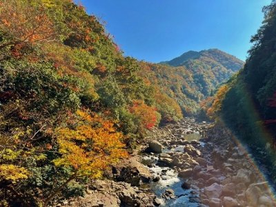 奇岩や滝、深淵など、急流と岩々が織りなす変化に富んだ風景と美しい渓谷が印象的で、春はヤマザクラ、夏は新緑、秋は紅葉、冬は雪景色と四季折々に変化する自然は見るものの心を癒してくれます。なかでも秋の紅葉は有名で、11月上旬から中旬にかけて色鮮やかな紅葉が水面も赤く染め、渓谷が1年で最も美しい季節に変化します。