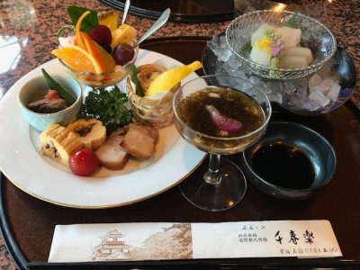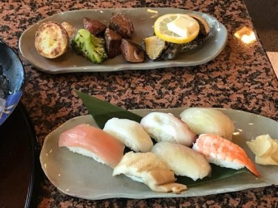 (カットステーキ、あわびステーキ、握り寿司、お刺身、前菜、デザート)