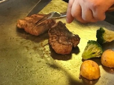 今回は鉄板焼きのカットステーキ、あわびステーキ等をメインでお出ししております。