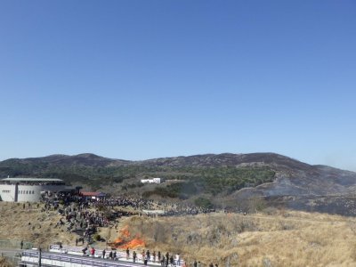 秋吉台に春を呼ぶ早春の風物詩である山焼きは、昔は、伸びた雑草を燃やして新芽を育て家畜のための採草や放牧の目的で行われていました。