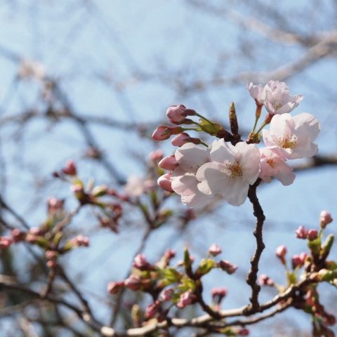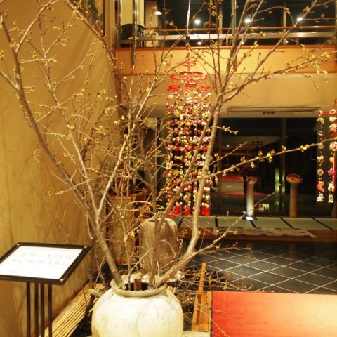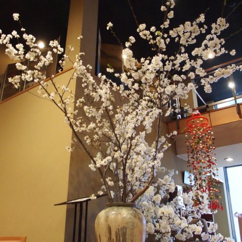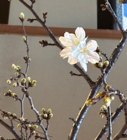 ロビーの桜がようやく開花いたしました。 東京は明日、明後日の開花予想...