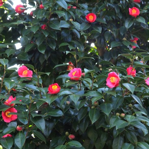 萩市笠山の半島東面の椿原生林の椿の花の開花宣言がされました。各イベ...