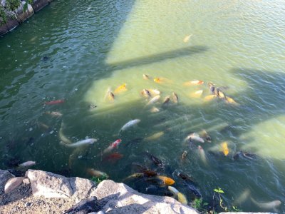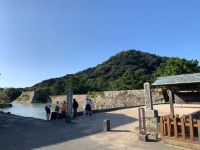 指月公園入口です。修学旅行の生徒さんが班別で散策中! 堀の鯉は人影が見えるとエサを貰えると思い寄ってきます。