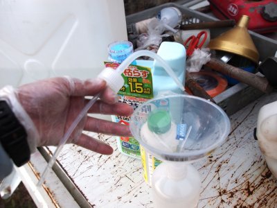 除草剤希釈時はプラスチック製手袋で被曝を避ける