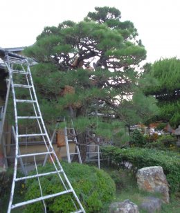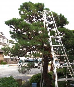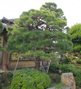 庭の黒松は此処に座って30年前後ですが、幹径・枝振りからして最低でも200年~300年?の樹齢と思われます。YouTubeの黒松剪定の動画は若い庭師さんや趣味で代々庭木を弄って来た50代以上の中高年層が多く地域は関東から東海の比較的暖かい処の都市部で、空襲で焼けてしまったのか小振りな黒松の20~30年の庭木が多く地域の好みか樹形が萩辺りと異なります。出雲大社の隣りの庭木の育成畑の辺りはコノ樹形と同じような3mサイズが多く大根島の「由志園・ゆしえん」にも似た松が多く植わっていましたので地域性がある様です。