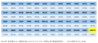 バイアス・思い込みの激しい「わたくし」の頭では、信号機の無い横断歩道の停止率は幕末の「尊王攘夷運動」の活発であった県では低い様であるとエコーチャンバー現象が始まった。鹿児島 39.6%、佐賀 40.0%、高知 42.2%、茨木 35.2%、山口 42.9%、京都 45.3%。陸奥宗光の和歌山 36.2%、松平春嶽は福井 34.7%,隣接県が意外に停止率高い…地理・地域特性では無い?・・・こうと思ったら突っ走る志士の気質がまだ残っていて辺りが見えない?(私見ですが)