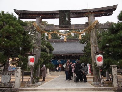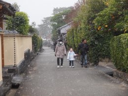萩城下町や武家屋敷街は、雪が激しく降り出して店舗や車に乗り込み観光客の姿が通りから無くなりました。