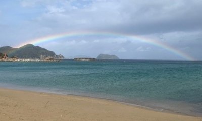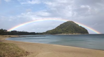 2021年04月13日(火) スタッフブログ -千春楽の出来事- 本日の菊が浜(雨、風のち虹) 昨夜は雨、風も酷く春の嵐のような天気でした。 今朝は小雨→晴れ。 菊が浜に出てみますと、指月山の向こう側空に大きな虹が掛かっていました。