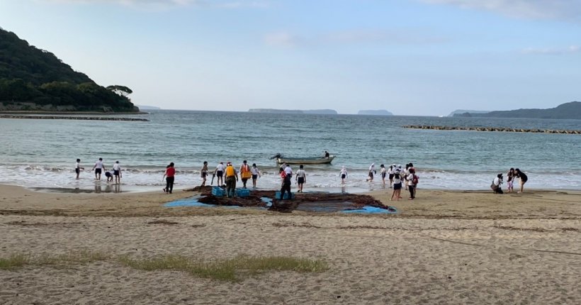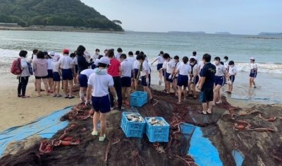 2021年10月08日(金) スタッフブログ -千春楽の出来事- 地引網体験 広島市の小学生の修学旅行 様のアトラクションで地引網体験を実施いたしました。 今回は大漁で獲れた魚は、夕食時に調理してお出ししました。 自然が相手ですので、あまり獲れないときもございますが今回は大漁で良かったです。