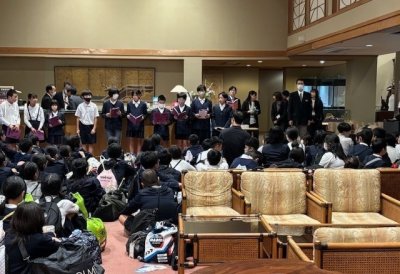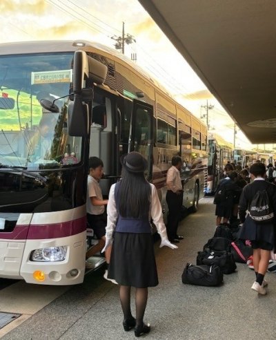 明倫小学校の校庭が駐車場になり、警備員のオジイサンが4人も立っていました。