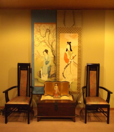 お雛様に床置きは万葉美人の彫刻、掛け軸は「唐美人」と「万葉美人」の掛け軸としました。お雛様も飾りました。